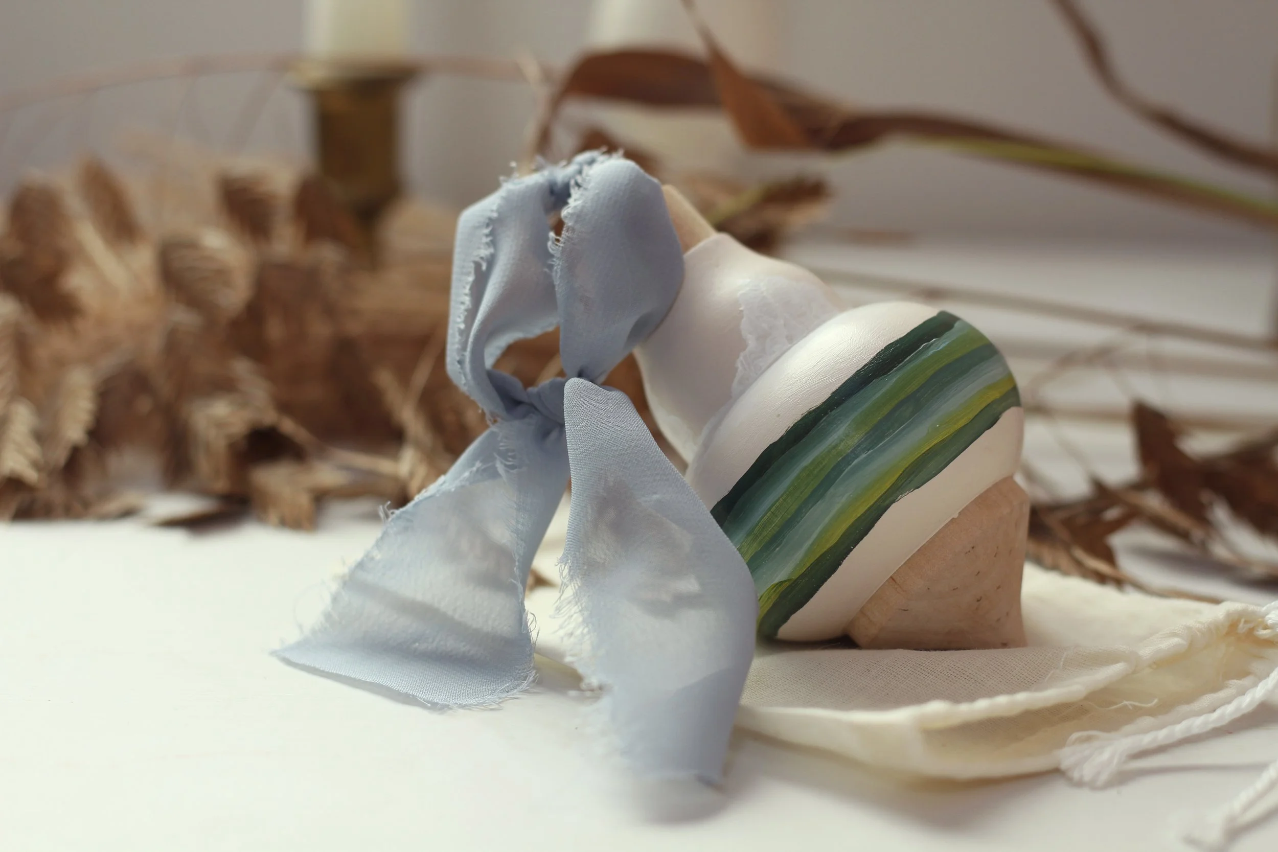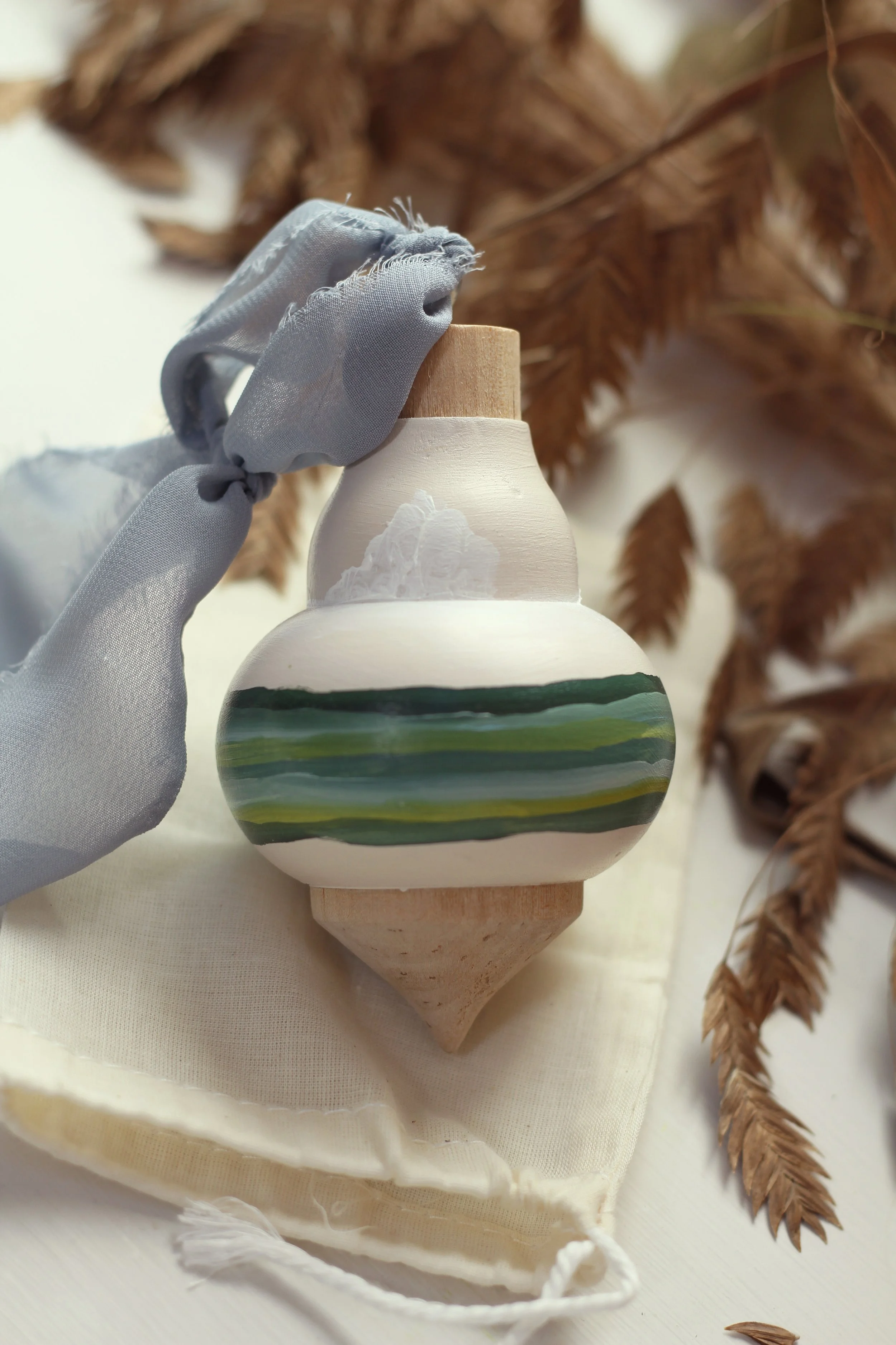 These landscape painted ornaments with fluffy, dreamy clouds are an extension of my popular ‘A Peaceful Place’ collection. Their imperfect lines of earthy colors resemble the layers and stages of life. Their smooth transitions and appealing shape are meant to be a symbol that life goes on despite the ups and downs that come and go. Know that these are lovingly painted with extra love.